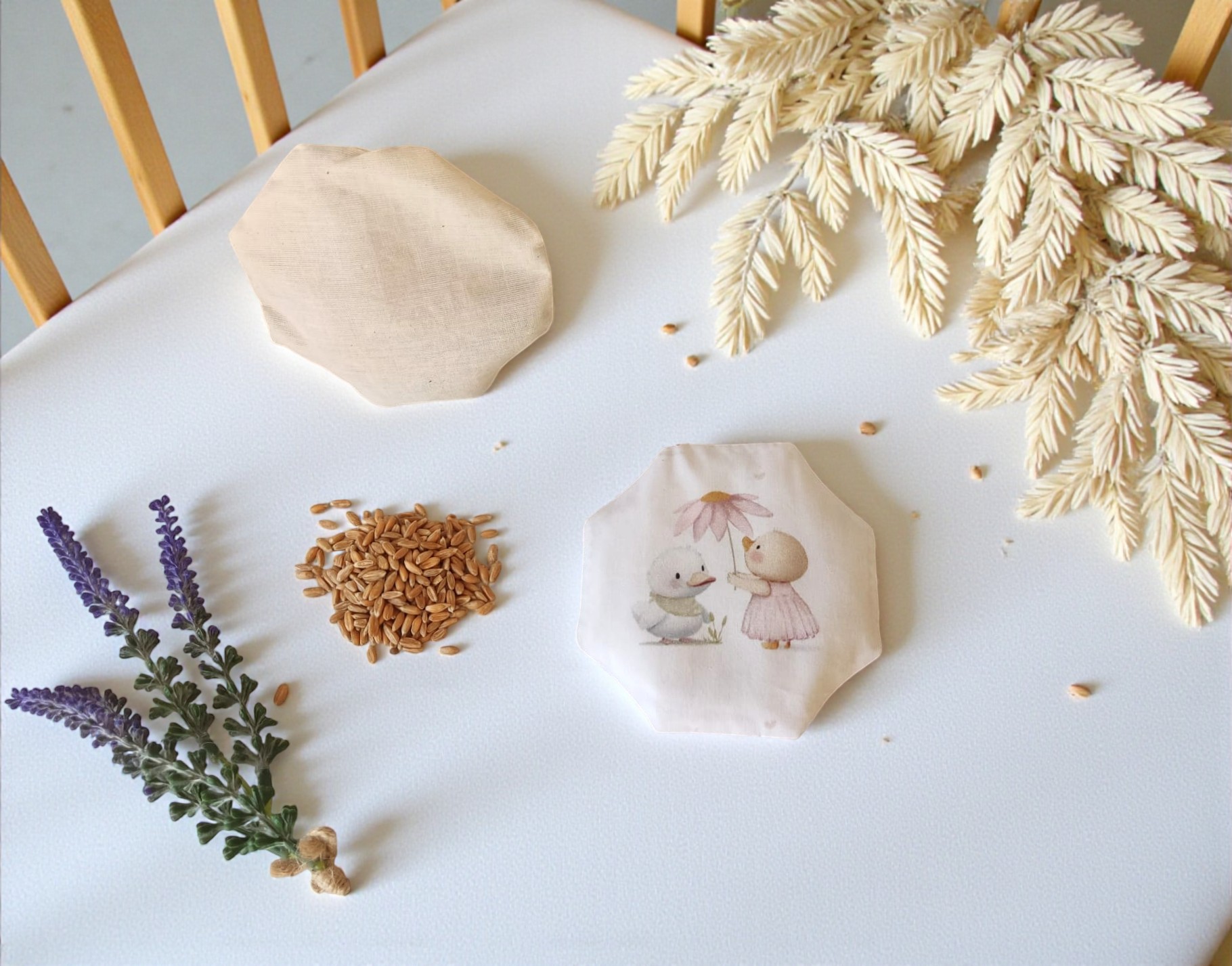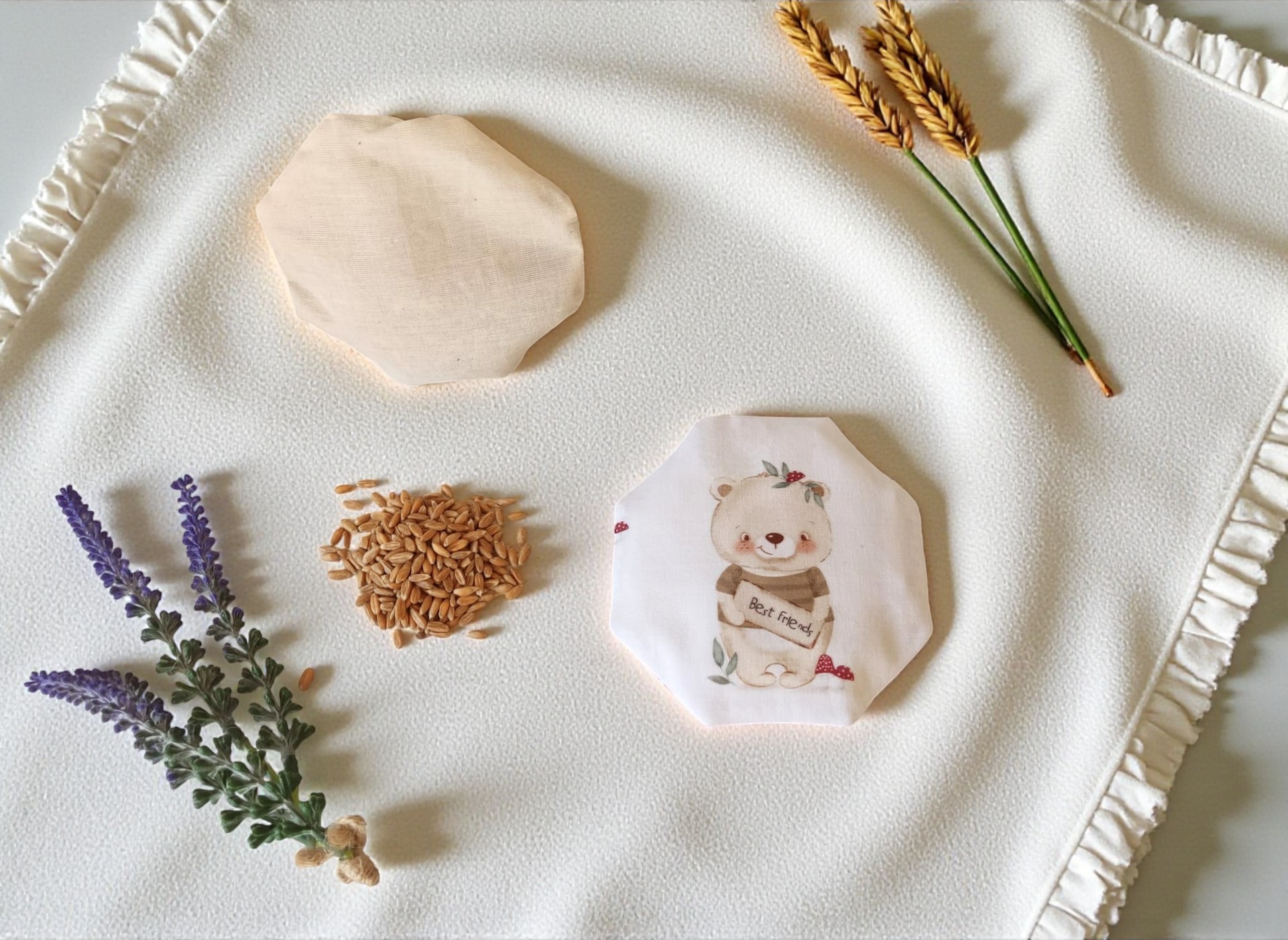 Todos nuestros saquitos están confeccionados a mano, con telas 100% algodón y rellenos de semillas de cultivo ecológico.