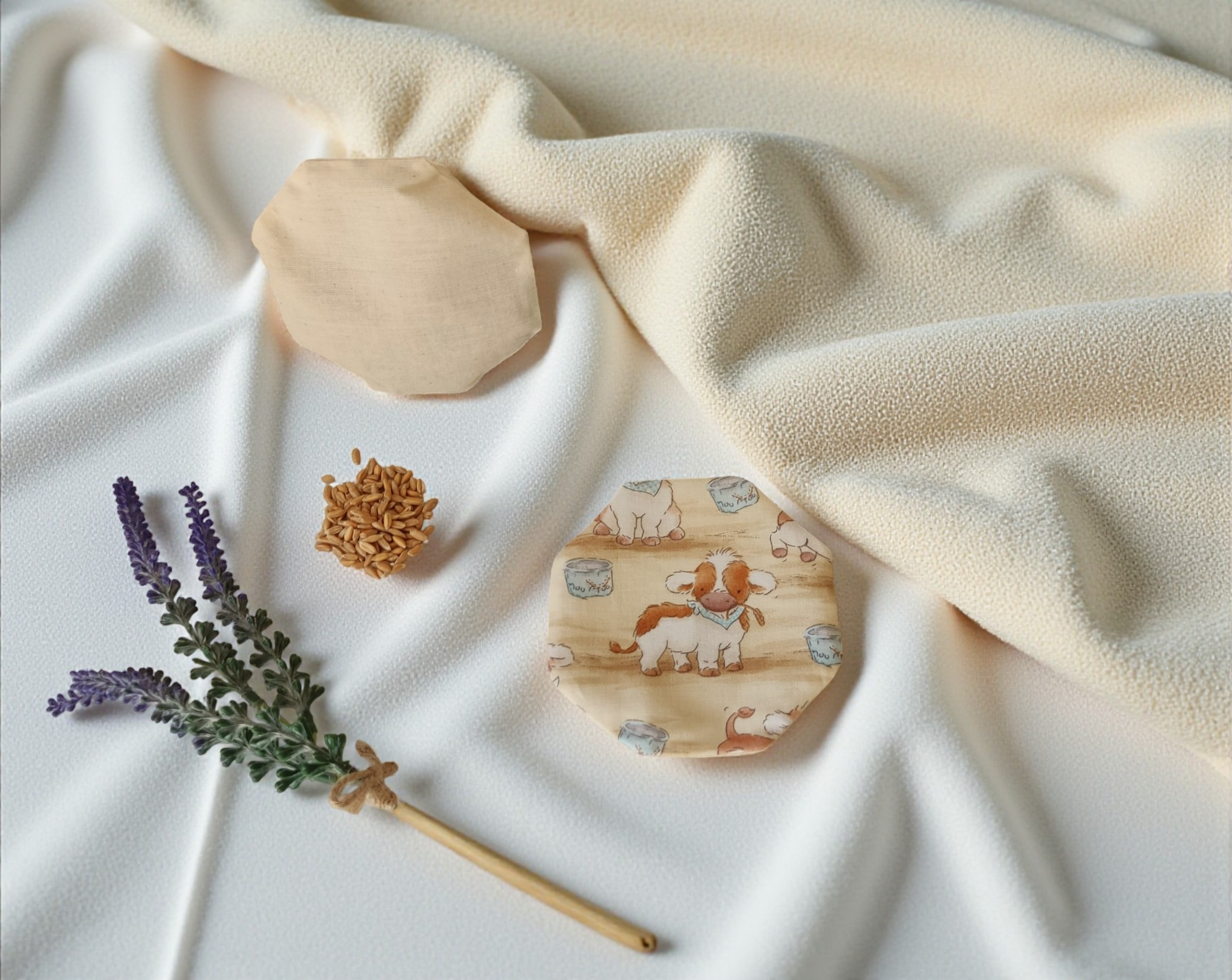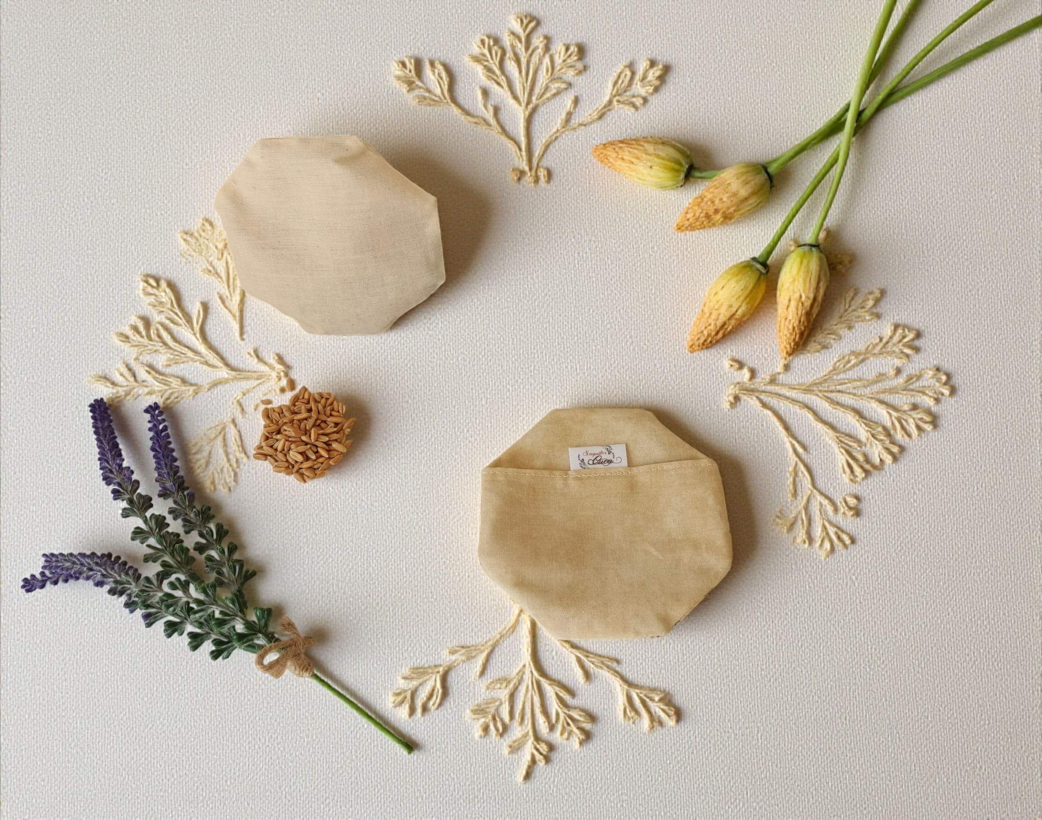 Contienen semillas de espeta, que absorben rápidamente el calor y lo desprenden de forma gradual, y granos de lavanda que facilitan la relajación